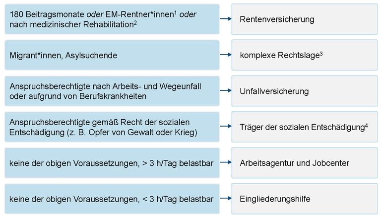 Die Grafik dient der grundsätzlichen Orientierung und bildet die häufigsten, aber nicht alle denkbaren Szenarien ab. 1 aktueller Bezug einer Erwerbsminderungsrente; 2vorliegende Empfehlung aus einer medizinischen Rehabilitation wegen drohender Erwerbsunfähigkeit; 3abhängig von Herkunft und Aufenthaltsstatus; 4 Inklusionsämter, Hauptfürsorgestellen, (Landes-)Versorgungsämter erstellt mit Unterstützung von Manfred Becker (Deutsche Gesellschaft für soziale Psychiatrie) und Prof. Dr. Hans-Christoph Eichert (Pädagogische Hochschule Heidelberg, Institut für Sonderpädagogik, Berufliche Rehabilitation und soziale Integration) |