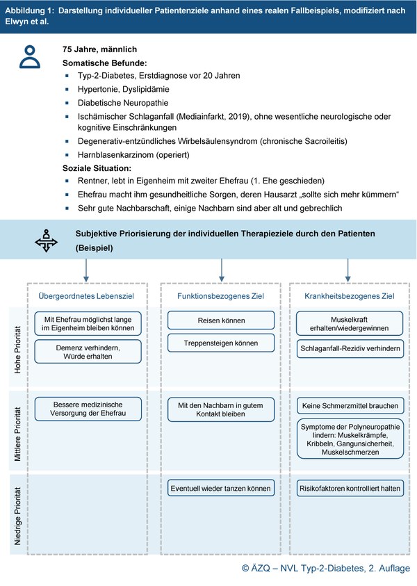Häufig führen krankheitsbezogene (z. B. Schmerzen lindern) oder funktionsbezogene Ziele (z. B. Gehstrecke verbessern, Treppensteigen können) zur Konsultation der Ärztin/des Arztes. Bei der Vereinbarung individueller Therapieziele ist es oftmals günstig, mit den übergeordneten Lebenszielen zu beginnen, da sie die funktions- und krankheitsbezogenen Ziele beeinflussen ("Top-down-Ansatz"). Falls es den Betroffenen schwerfällt, übergeordnete Lebensziele zu formulieren, können auch konkretere, funktionsbezogene und krankheitsbezogene Ziele gemeinsam erarbeitet werden. Darauf aufbauend kann es dann leichter fallen, übergeordnete Lebensziele daraus abzuleiten ("Bottom-up-Ansatz"). Während der Vereinbarung von Therapiestrategien kann sich die Priorisierung der Ziele ändern, wenn potenzielle Konsequenzen der Therapie (z. B. bessere Stoffwechselkontrolle vs. Einschränkungen durch intensivierte Therapie) oder beeinflussende Kontextfaktoren (z. B. Essgewohnheiten in der Familie) deutlich werden. Bei konkurrierenden Zielen kann eine Abwägung notwendig sein. Einige Beispiele aus Sicht des Menschen mit Typ-2-Diabetes gibt Tabelle 2.