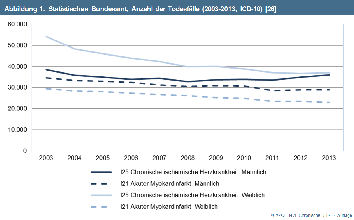 Die chronische KHK und der akute Myokardinfarkt führen die Todesursachenstatistik in Deutschland an, wobei in den letzten zehn Jahren der Anteil der Todesfälle gesunken ist 24179. Im Vergleich zu 2003, als 10,9% (n = 92 637) der Verstorbenen einer chronisch-ischämischen Herzkrankheit und 7,5% (n = 64 229) einem akuten Myokardinfarkt erlagen, sank der Anteil 2013 auf 8,2% (n = 73 176) bzw. 5,8% (n = 52 044). Von den 2013 an einer chronisch-ischämischen Herzkrankheit Verstorbenen waren 49% (n = 36 049) Männer und 51% (n = 37 127) Frauen, von den an einem akuten Myokardinfarkt Verstorbenen 56% (n = 28 991) Männer und 44% (n = 23 053) Frauen 24179.